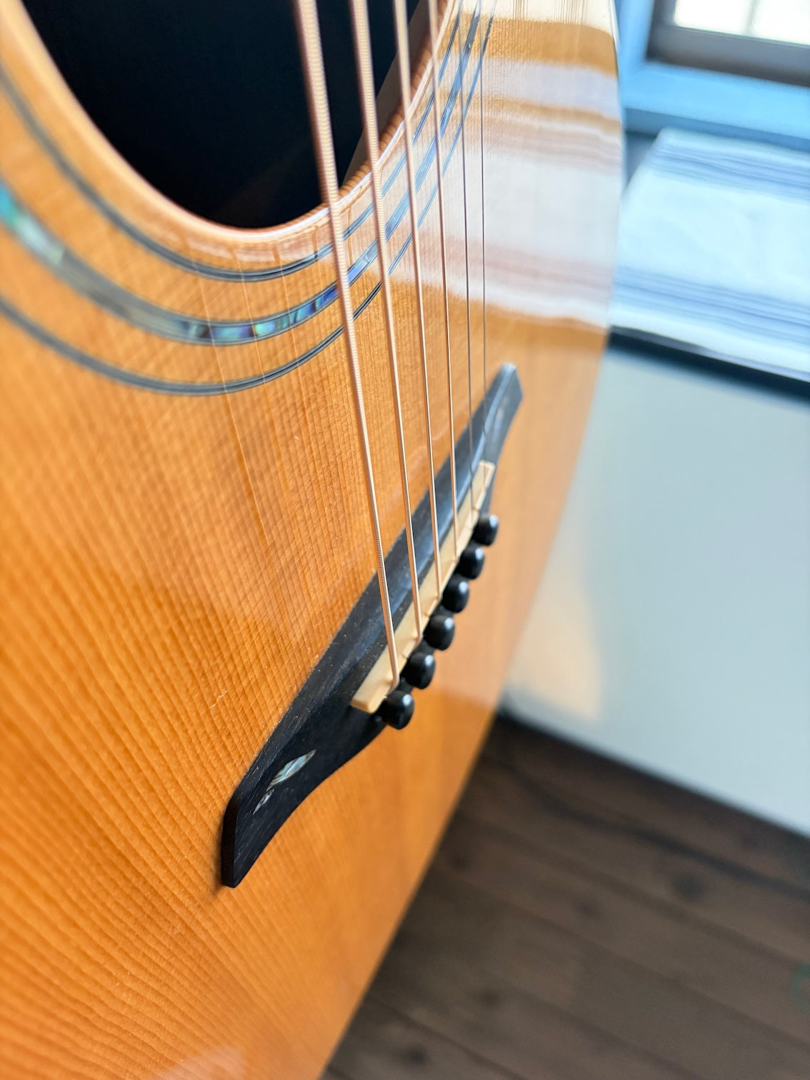 Overall, the guitar is in excellent condition with no scratches or dents. The endpin hole has been enlarged to 12mm, indicating a pickup was likely installed in the past. It is currently removed. There is also no strap pin installed in the neck heel.