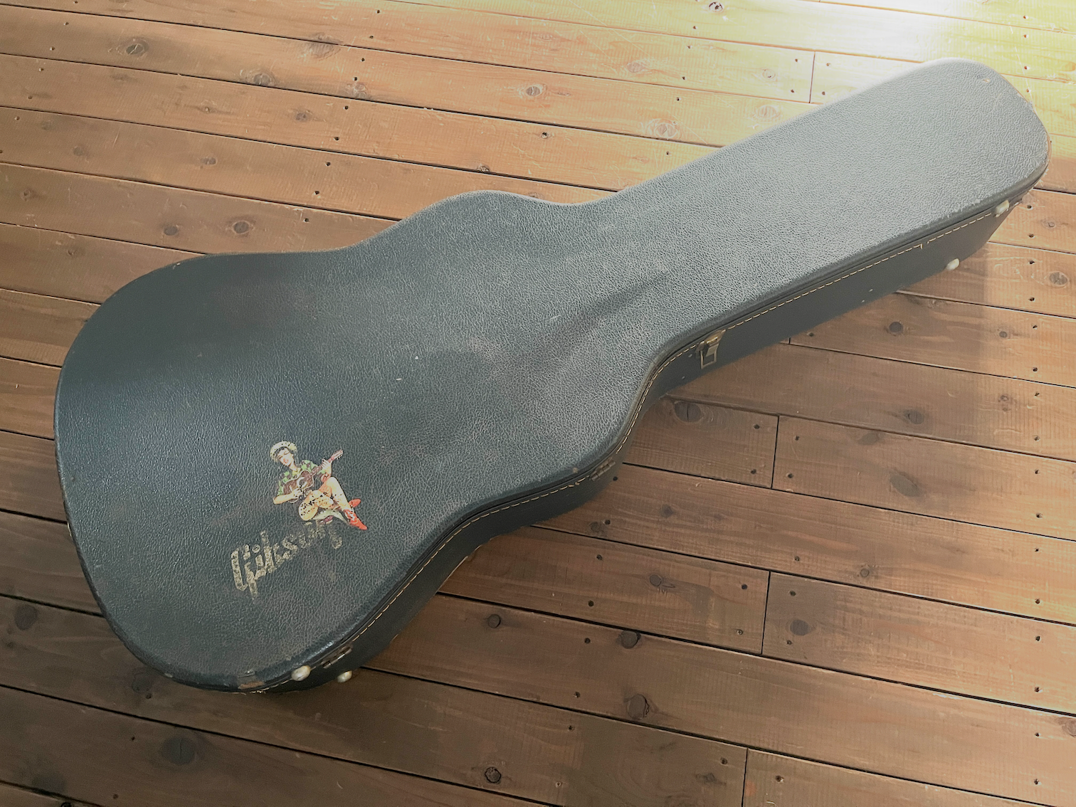The resin binding, common on Gibsons from this era, shows deterioration and is chipped in places. The bridge has been shaved down to lower the string height, leaving almost no saddle remaining. Otherwise, there are no major scratches, cracks in the wood, or evidence of repairs.