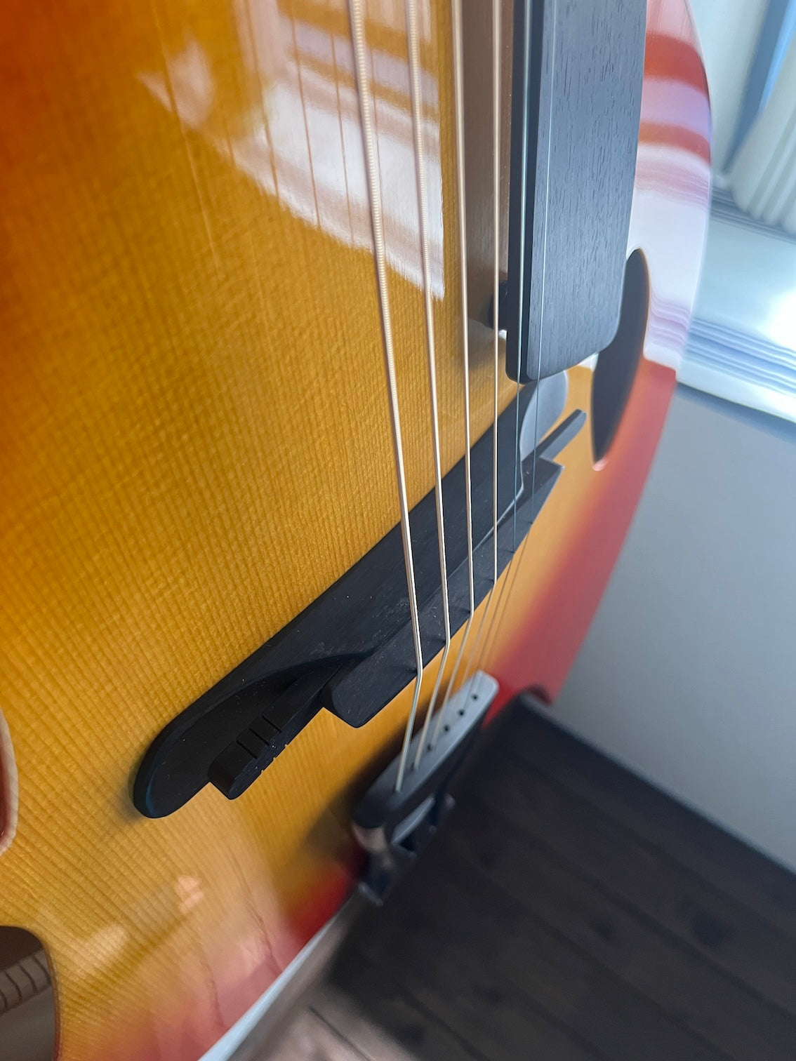 スプルーストップ、Xブレーシング、バックとサイドはフレイムメイプル材を使用。D'Aquisto独自の「Accutone」ブリッジは、金属製のホイールやポストを使用せずにソリッドウッドのみで作られ、弦振動を直接響板に伝えています。