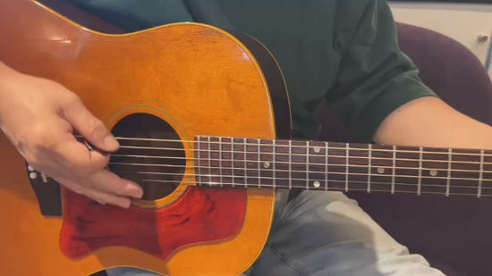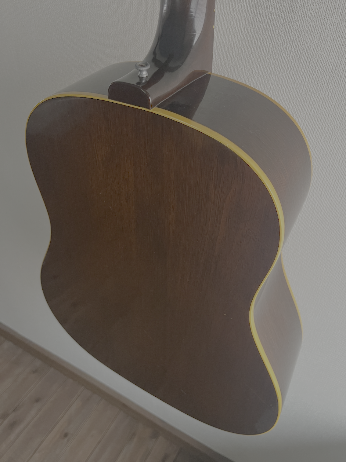トップ左下のバインディング近くににぶつけたような割れがありますが、裏側からパッチがされしっかりと補修されています。またナットの6弦側に欠けがあります。現時点で演奏に不具合はありません。小さな傷や打痕は多く、また塗装にも細かなひび割れなど経年感は出ていますが、そのほかに材の割れやその補修跡などは見当たりません。またピックアップの装着歴もありません。ペグやピックガードについてもオリジナルと思われます。