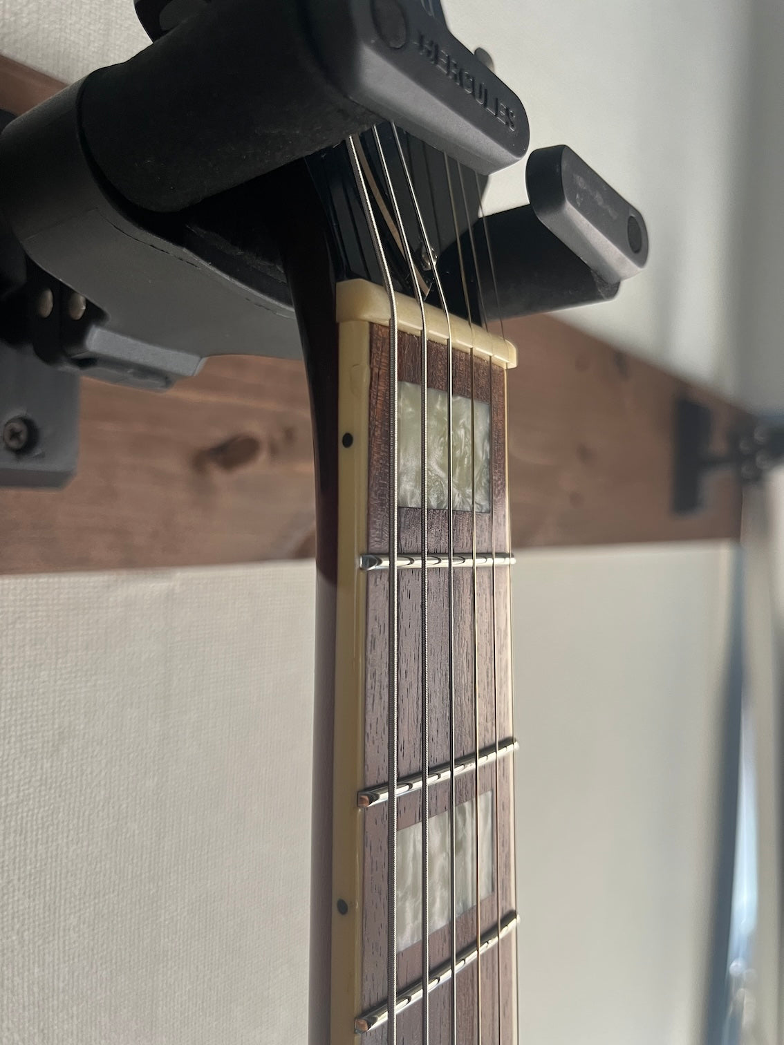 ネックの状態も問題なく、弦高は12フレット位置で6弦2.0mm、1弦1.5mmでビビり、音詰まりなどありません。弦高はサドルにて調整可能です。