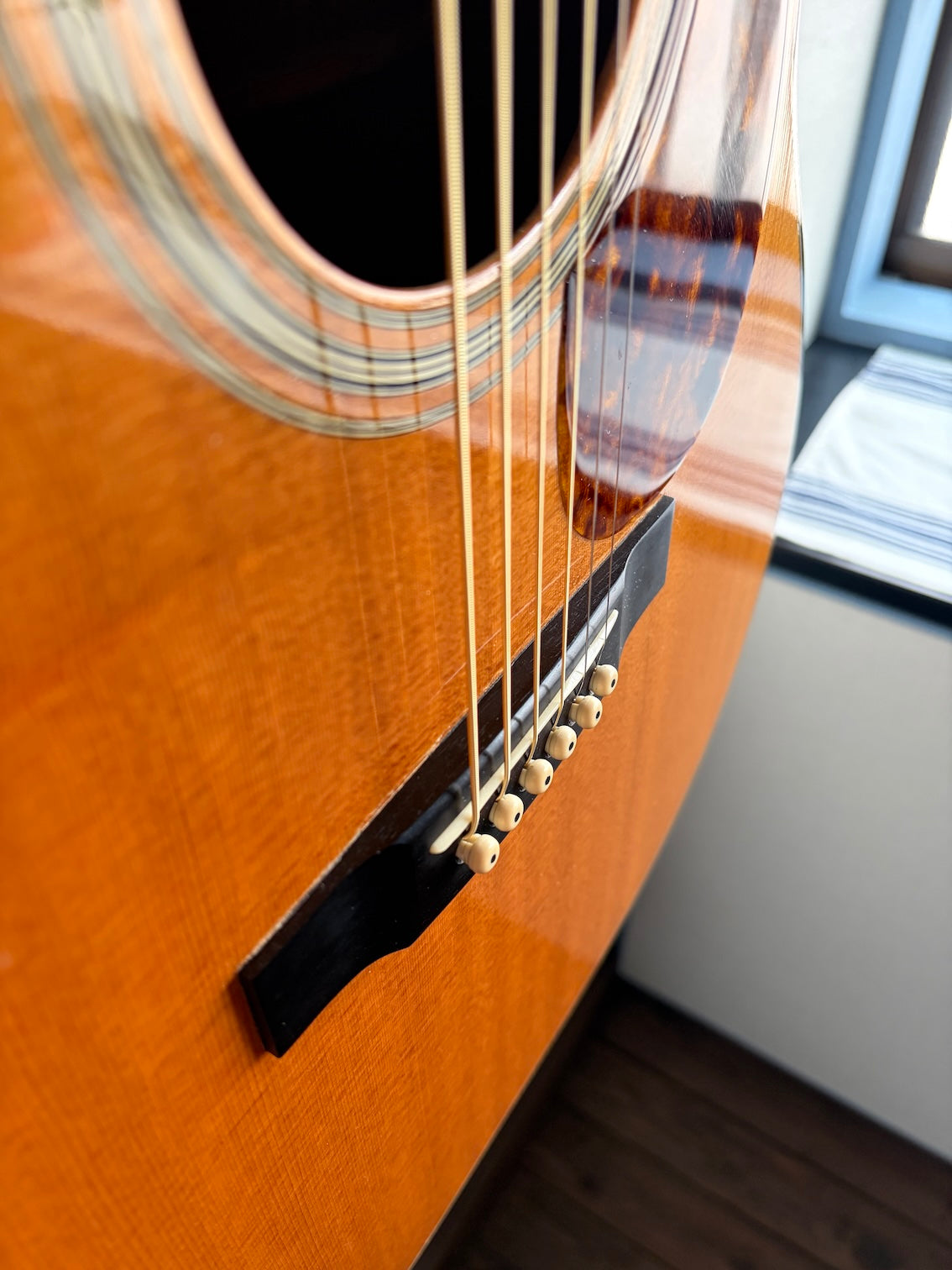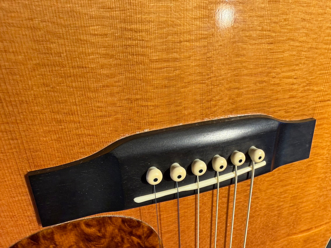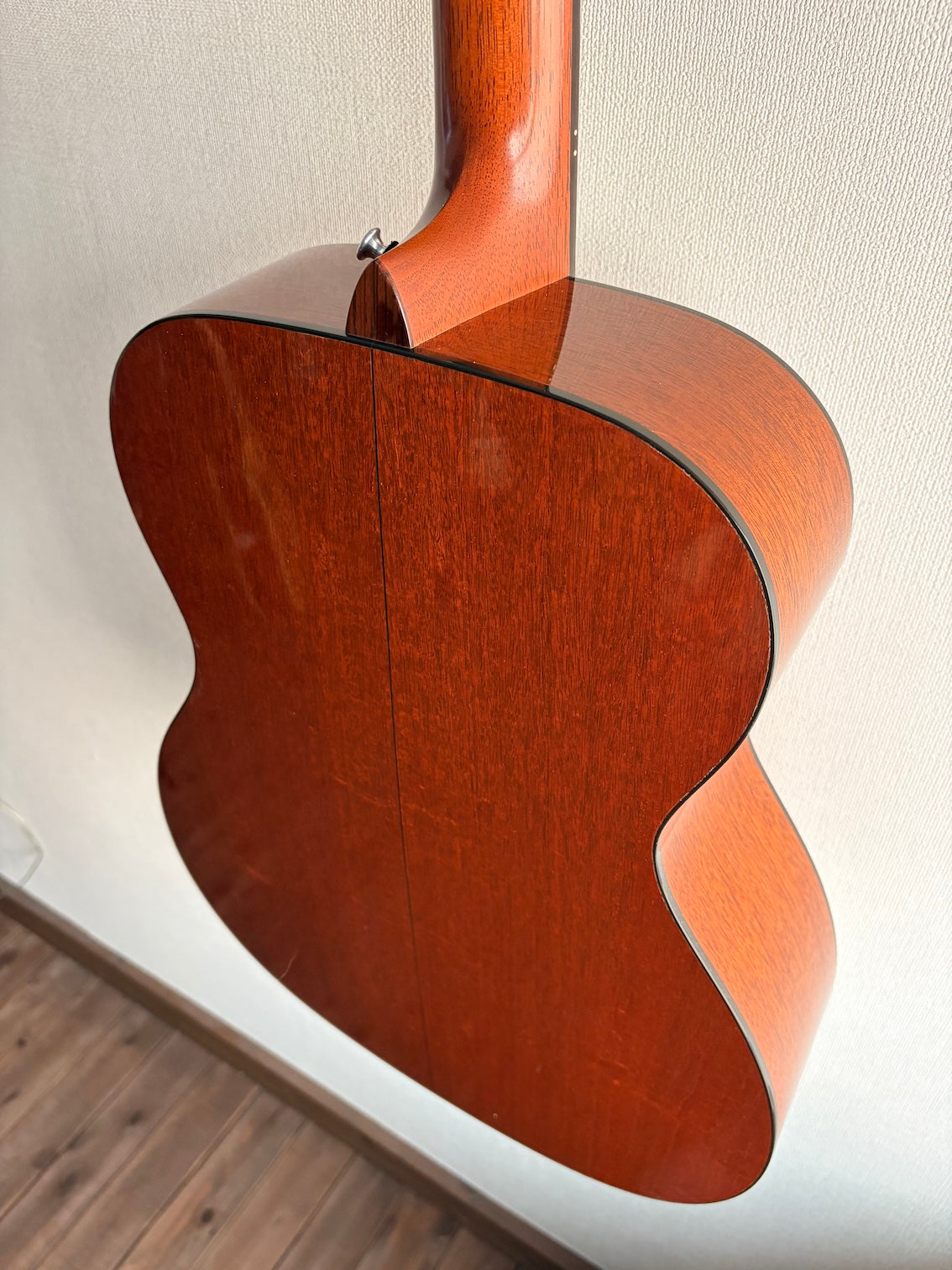 There are signs of re-gluing around the bridge area. The pickguard appears to have been replaced. Otherwise, there are no noticeable scratches or dents, and no cracks in the wood or evidence of repairs. A strap pin is attached to the neck heel. There is no history of pickup installation.