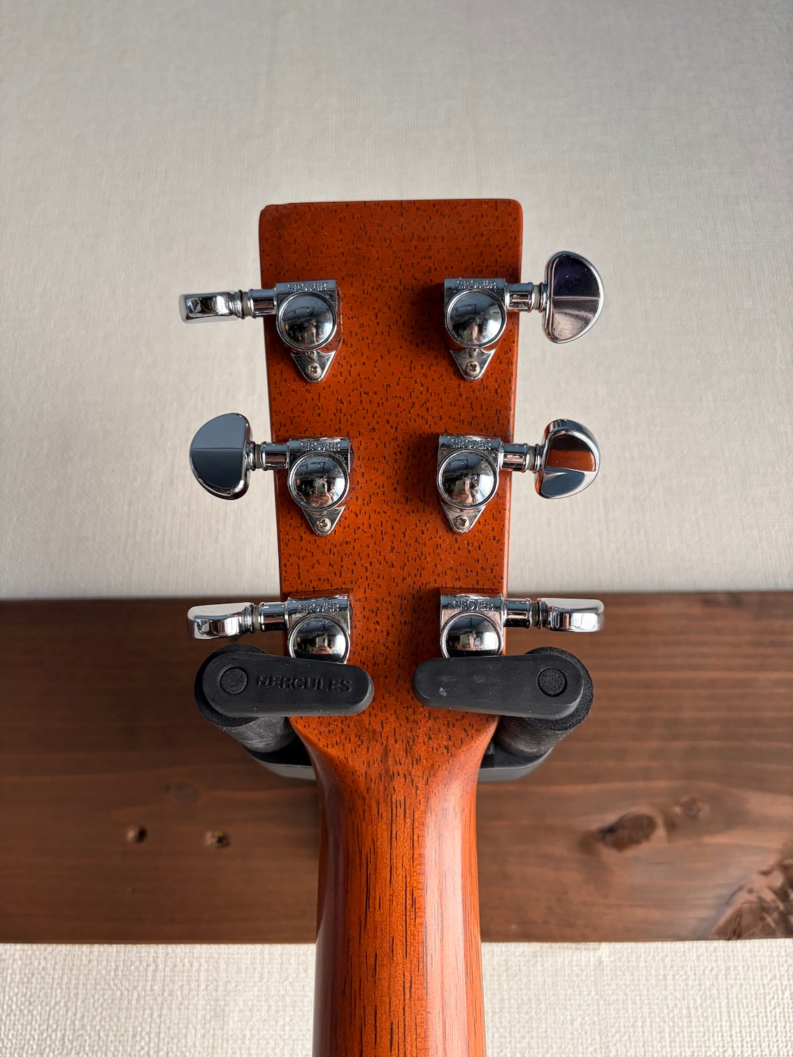 ブリッジ周りに再接着されたような跡があります。ピックガードが張り替えられているようです。それ以外は目立つような傷や打痕もなく、材の割れやその修復歴もありません。ネックヒールにストラップピンが装着されています。ピックアップの装着歴はありません。