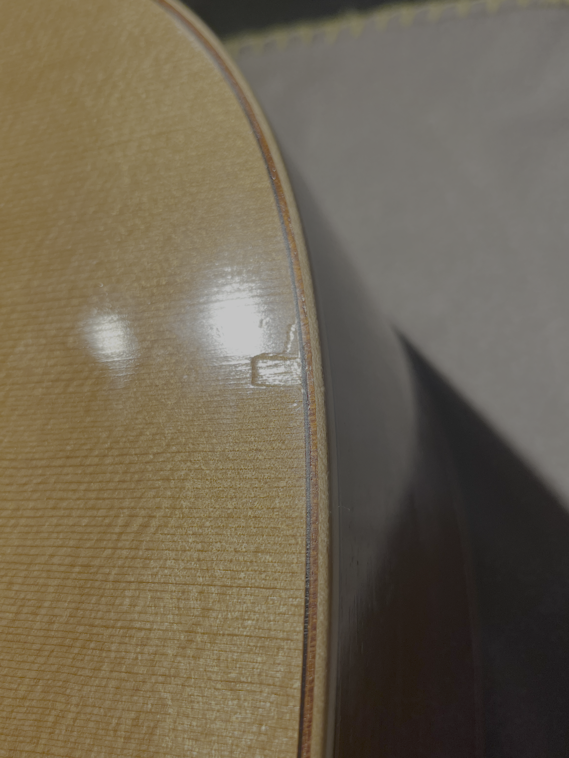 トップのボトム、バインディング近くに打痕が一箇所ありますが、そのほかには目立つような傷や打痕はなく、補修跡も見当たりません。