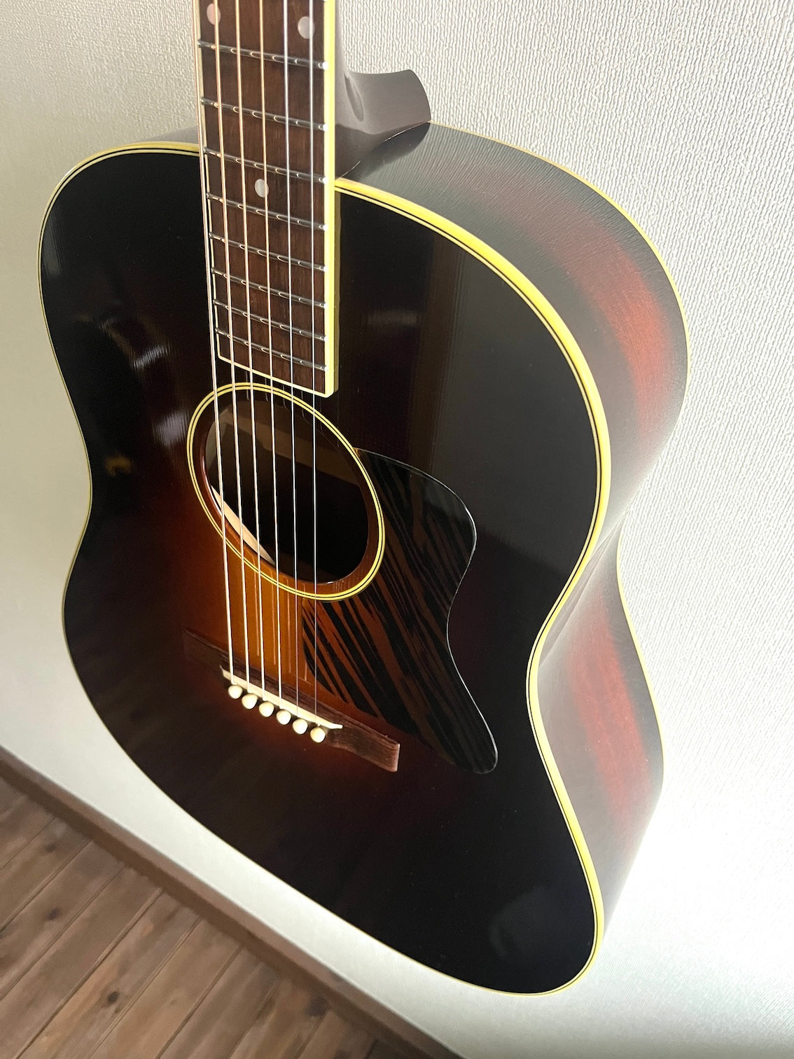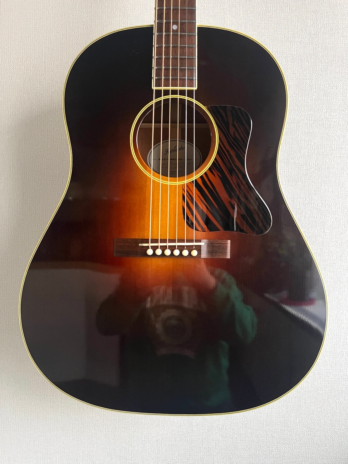 ギブソン系ルシアーとして評価の高い、米国バーモント州のデイル・フェアバンクスによるビンテージジャンボスタイルのギターです。1943年のJ-35をベースに製作されたモデルです。